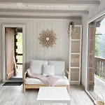 La Chalet Cocooning En Pleine Nature Villa con vista sul giardino, un balcone e un salottino, dispone di un divano. Il bagno è dotato di un bagno alla francese e una doccia, asciugacapelli e asciugamani.
